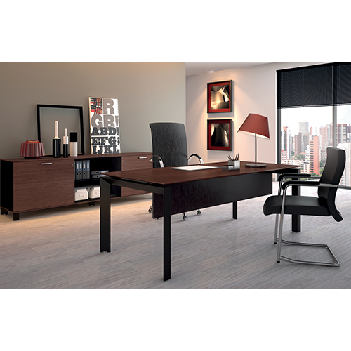 Linha de mobiliários para diretoria modelo sedute, tampos das mesas em MDF 26mm revestidos com laminas de madeira natural, usinada e envernizada, com tampo fixada na estrutura dando impressão de flutuar. Estrutura da mesa em tubos triangular com pintura eppoxi a pó.