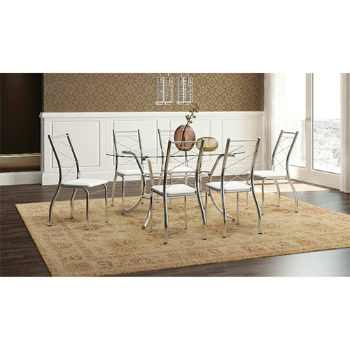 Mesa com Tampo em Vidro Modelo Oval – Estrutura Cromada – Carraro Linha Color- Cadeiras com Estrutura Cromada Assentos Revestidos em Napa Branco.