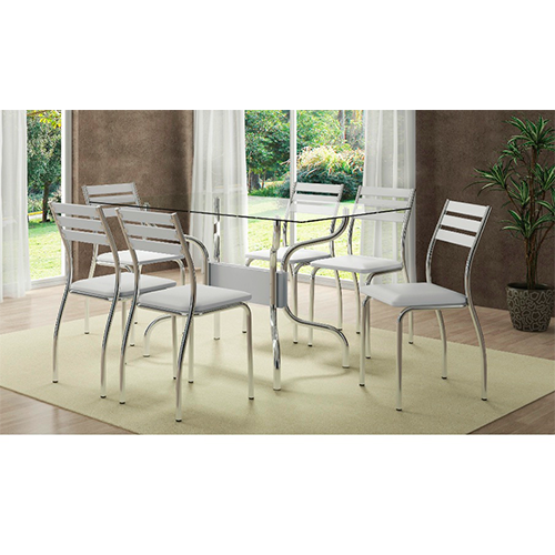 Mesa Vidro Incolor com Detalhe em Branco – Estrutura Cromada – Carraro Linha Star – Cadeiras com Assento em Napa Branca e Estrutura Cromada.