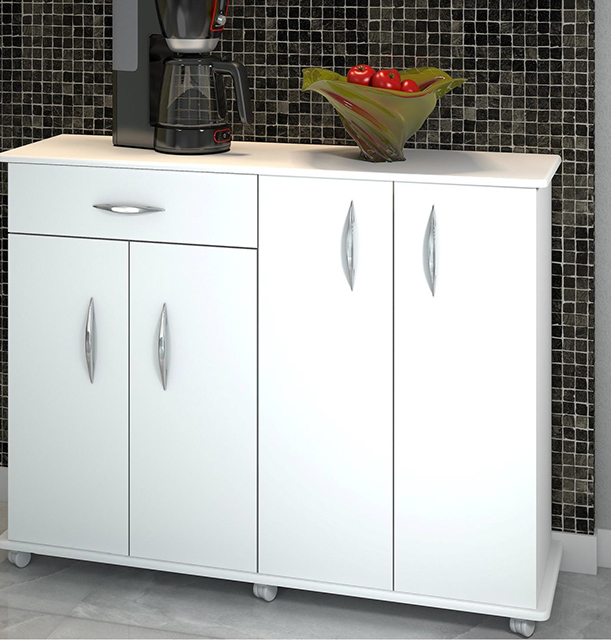 Armário Balcão Multi Uso com 04 Portas e Gaveta – Com Rodízios – Branco Alto Brilho